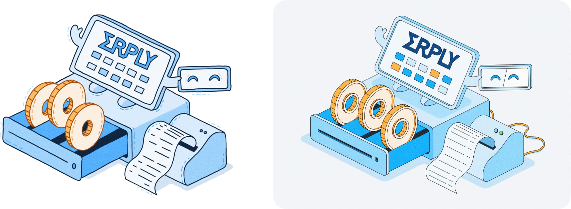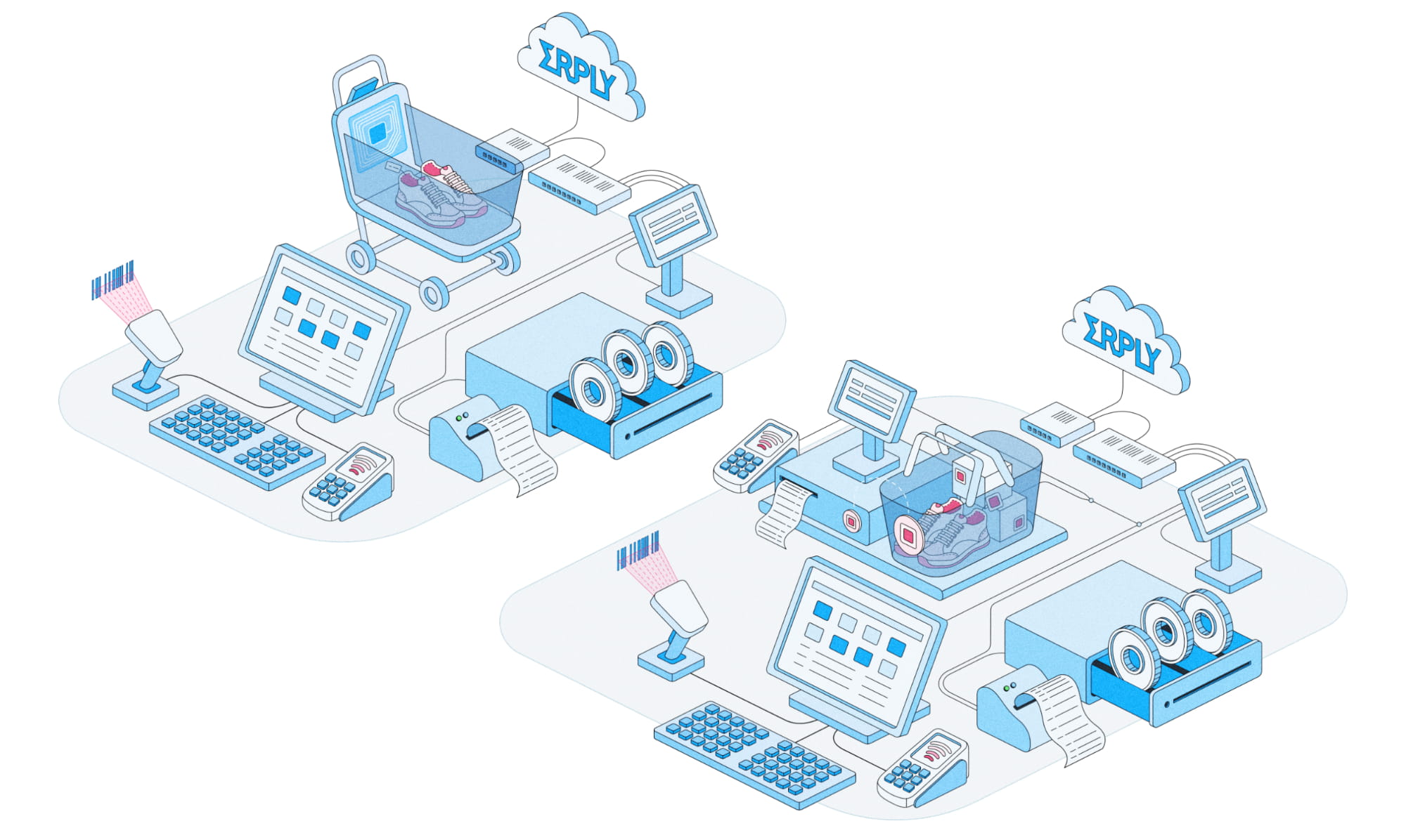 Illustratsioonid ühendavad tehnoloogilise täpsuse ja sõbraliku disainikeele, mis peegeldab ka Erply brändi olemust.