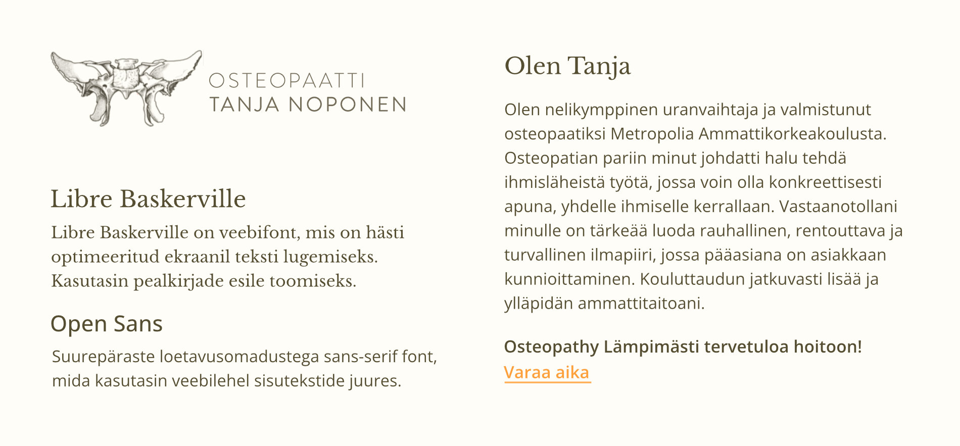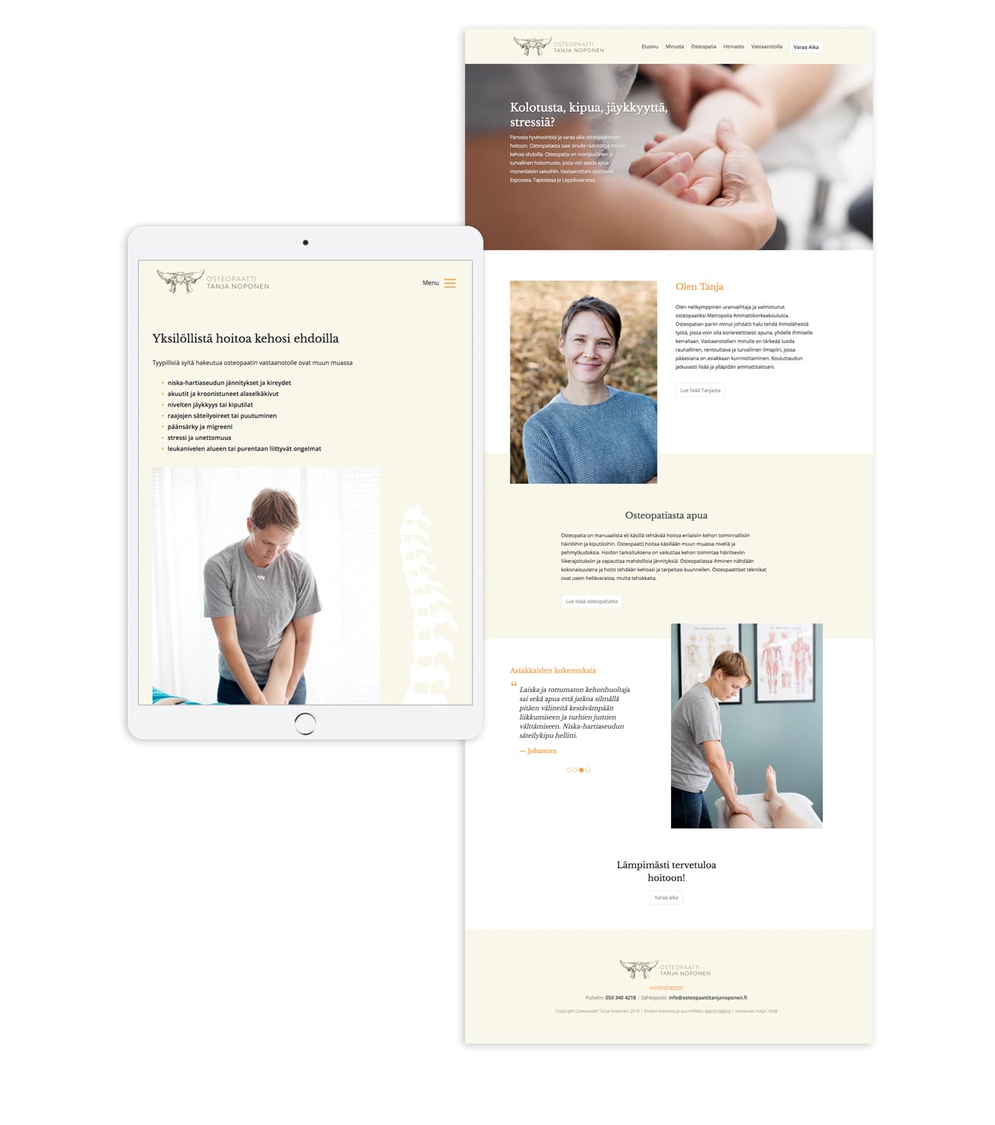 Tanja Noponen on vabakutseline osteopaat Helsingist. Ta soovis veebilehte, et ennast tutvustada, oma teenuseid pakkuda ja anda klientidele võimalus vastuvõtule aega broneerida.