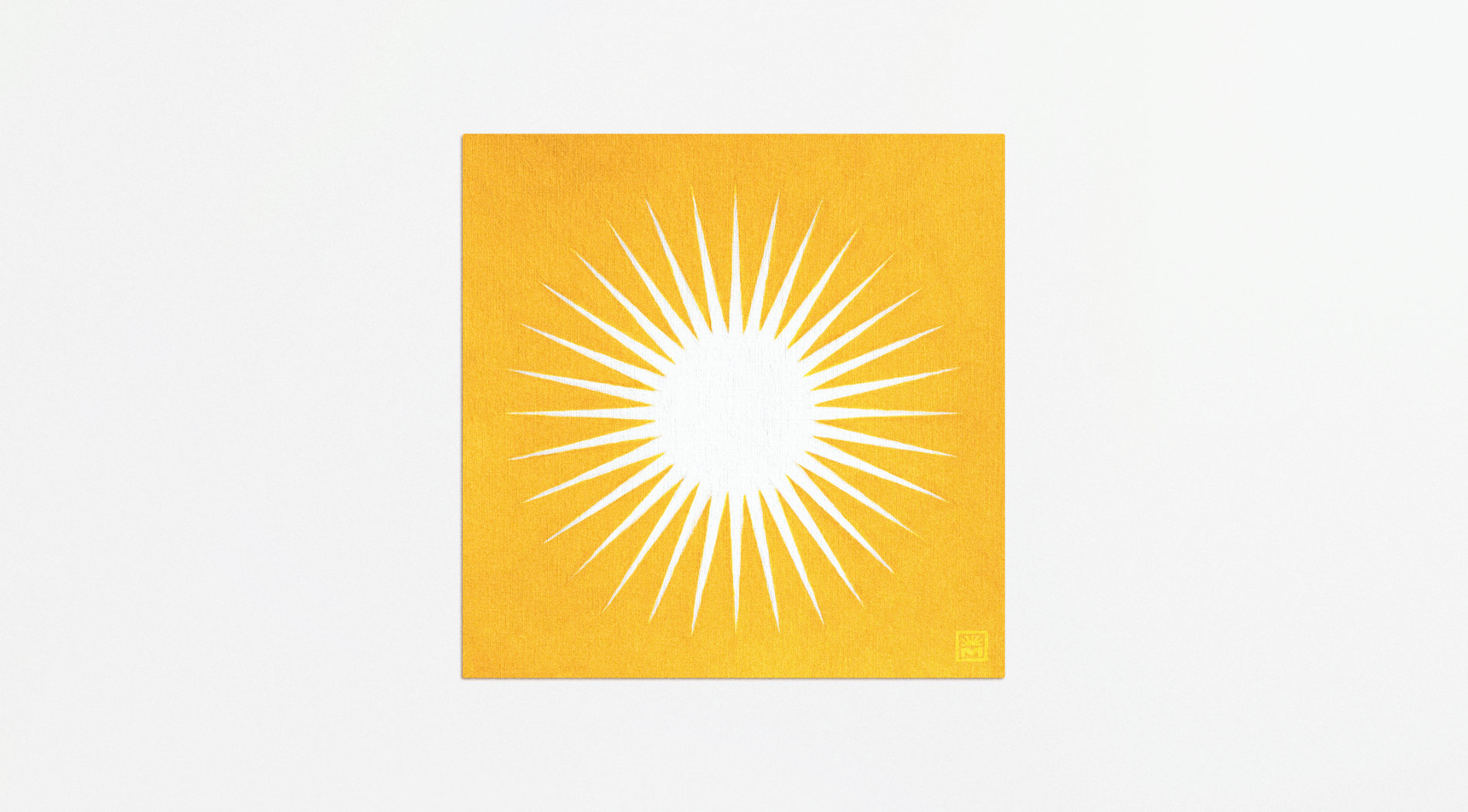 Väiksemõõtmeline õlimaal paberil, päike kollasel taustal. Vaadates tõtt suure päikesega.
