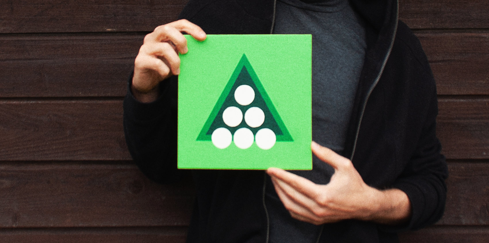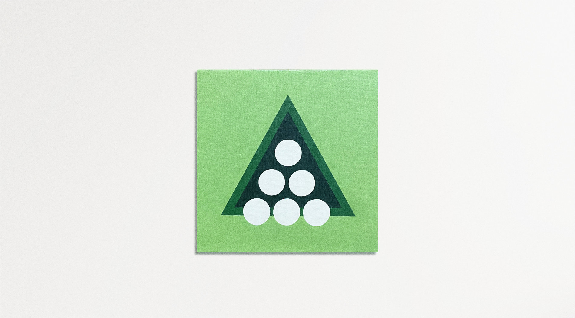 Tumeroheline kolmnurk, valged sõõrid ja heleroheline taust. Idee oli luua kujund, mis väljendab rahulikku liikumist tõusvas suunas.